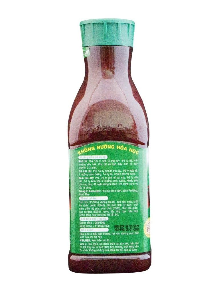 - Thành phần: dâu ( 37%), đường, nước, chất ổn định (440, 1442), chất điều chỉnh độ acid (330), hương đào tổng hợp, màu thực phẩm tổng hợp (129, 124), chất bảo quản (202, 211)